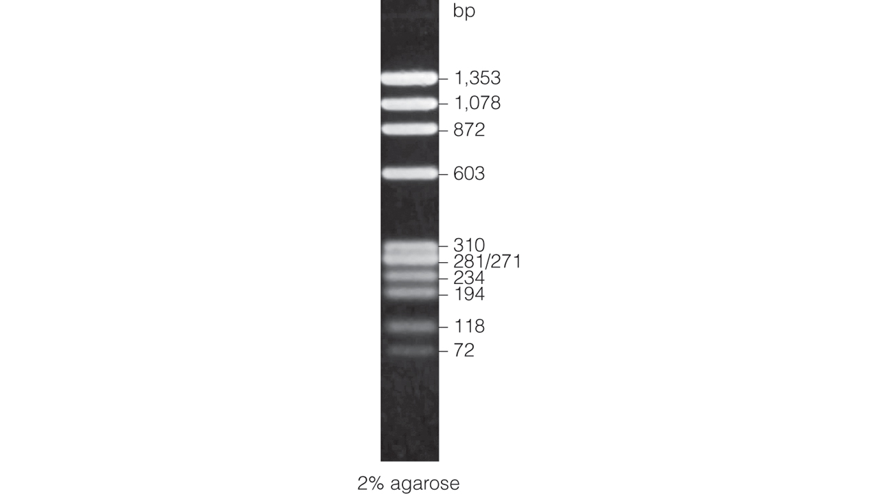 The BenchTop ΦX174 DNA/HaeIII Markers have 11 phenol-extracted, ethanol-precipitated DNA fragments ranging in size from 72bp to 1,353bp.